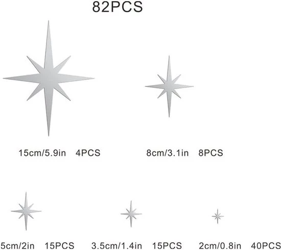 Advantages:This set includes 82 pieces of acrylic mirror wall stickers in various sizes, including 4 pieces of 15cm, 8 pieces of 8cm, 15 pieces of 5cm, 15 pieces of 3.5cm and 40 pieces of 2cm. Whether you want to add a subtle accent or cover an entire wall, these mirror stars are perfect for a variety of decorating needs.