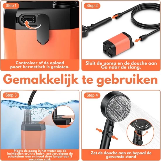 Camping Shower Kit Rechargeable - Electric Beach Shower - Outdoor Shower Pump with Smart Digital Display - Shower Head Nozzle for Camping - Outdoor Shower - Hiking, Travel, Washing - Orange (8721085278994)
