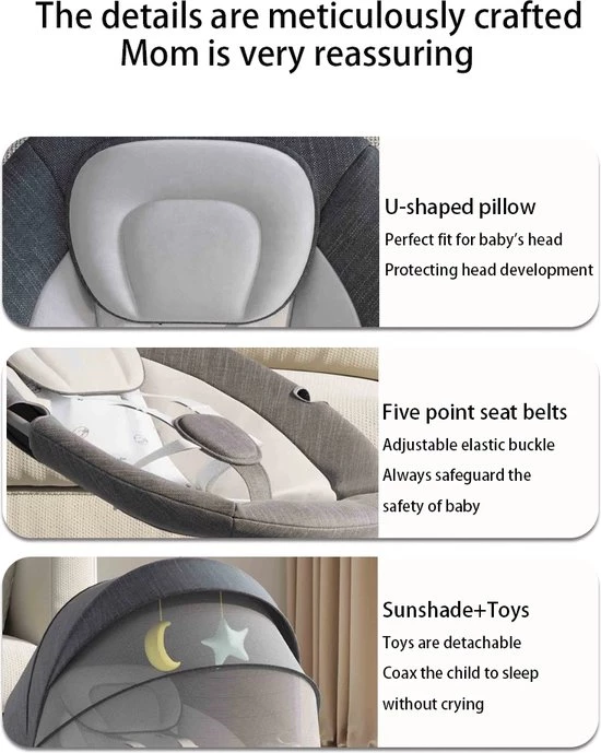 The crib is designed to make parenting easier, with an easy-to-use electric rocking system that soothes your baby without manual rocking. The sturdy frame provides maximum safety, while the lightweight construction makes the crib easy to move.