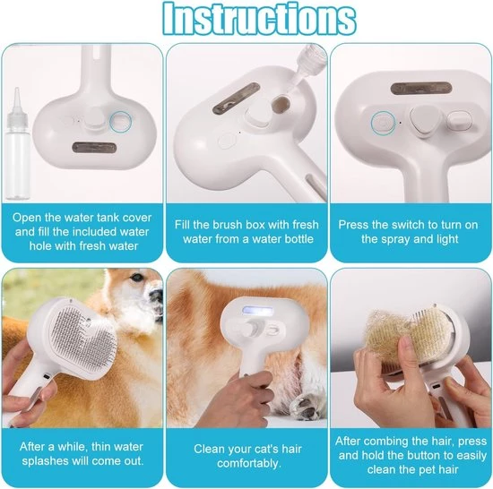 Directions for Use Use the spray function gently to avoid over-wetting your pet's hair. Turn the spray on and turn it off after 3-5 seconds for an optimal grooming experience.