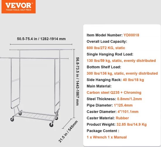 Extendable & Adjustable Garment Rack: The clothes rail of this garment rack can be extended from 50.5 to 75.4 inches (1282-1914 mm) and adjusted in height from 56.8 to 73.5 inches (1443-1867 mm). This versatility allows you to adjust the shelf to create a custom storage solution that perfectly suits your needs, whether you're organizing a collection of long garments or shorter garments.