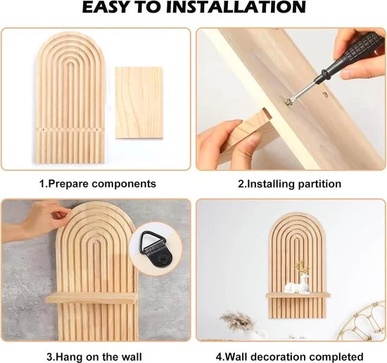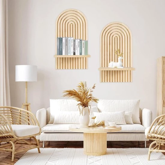This charming wooden wall shelf is the perfect decorative addition to any room. Made of solid pinewood, this shelf is not only lightweight and stable, but also has no sharp edges that can cut. The bohemian style adds a charming and creative element to your interior.