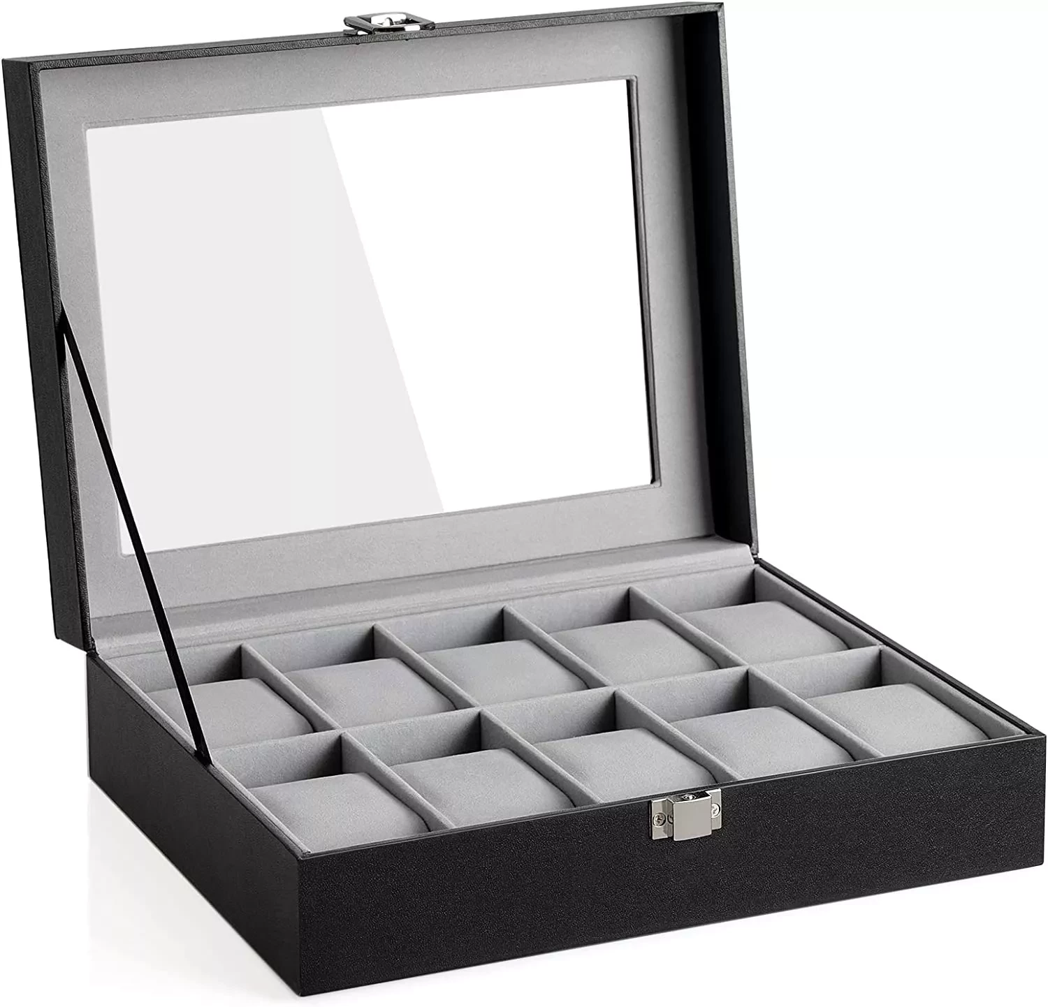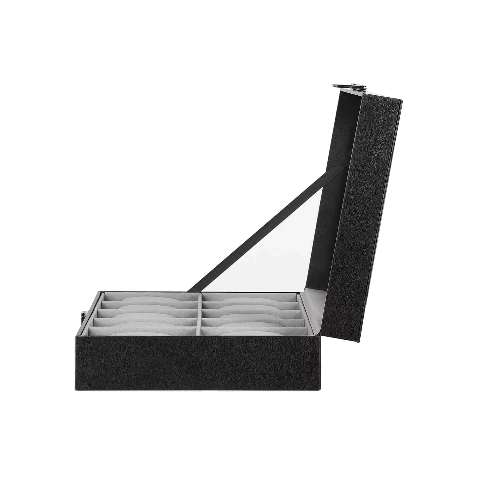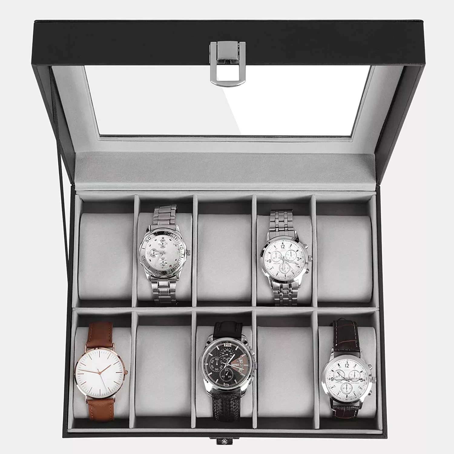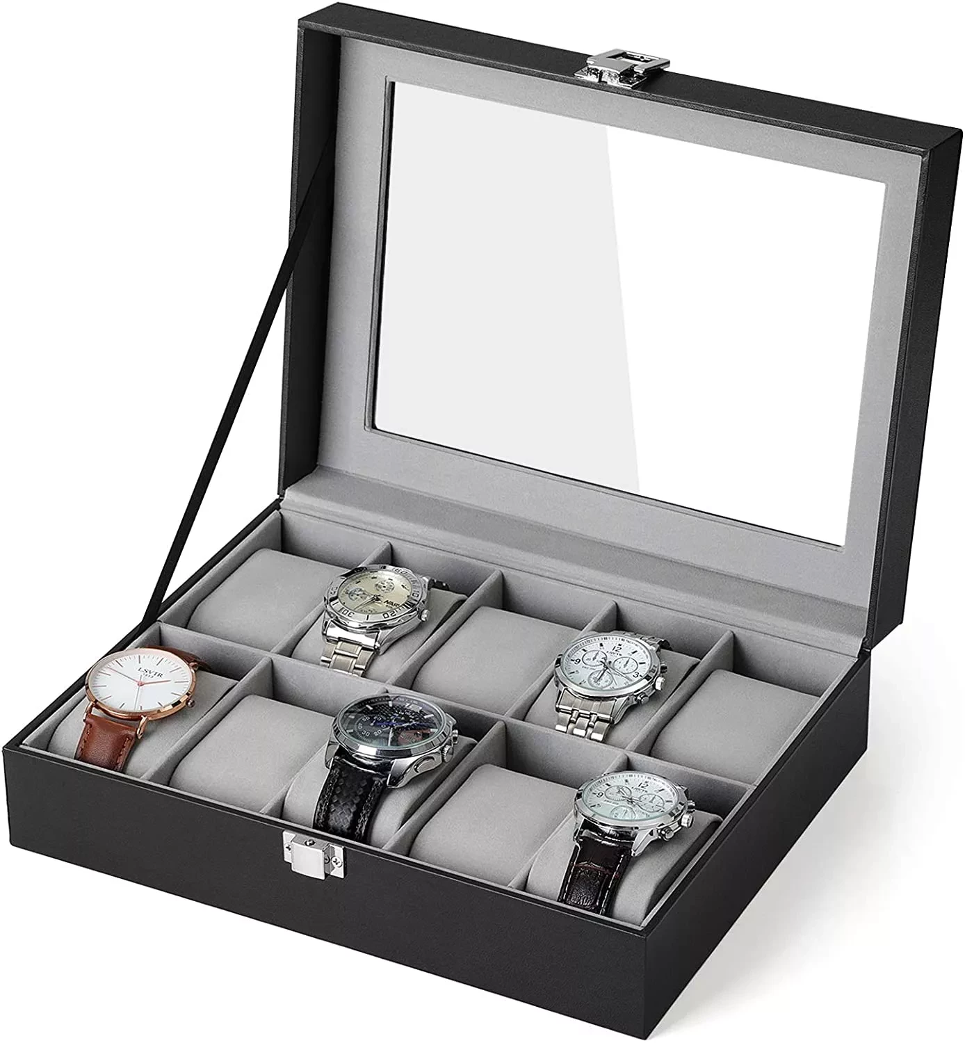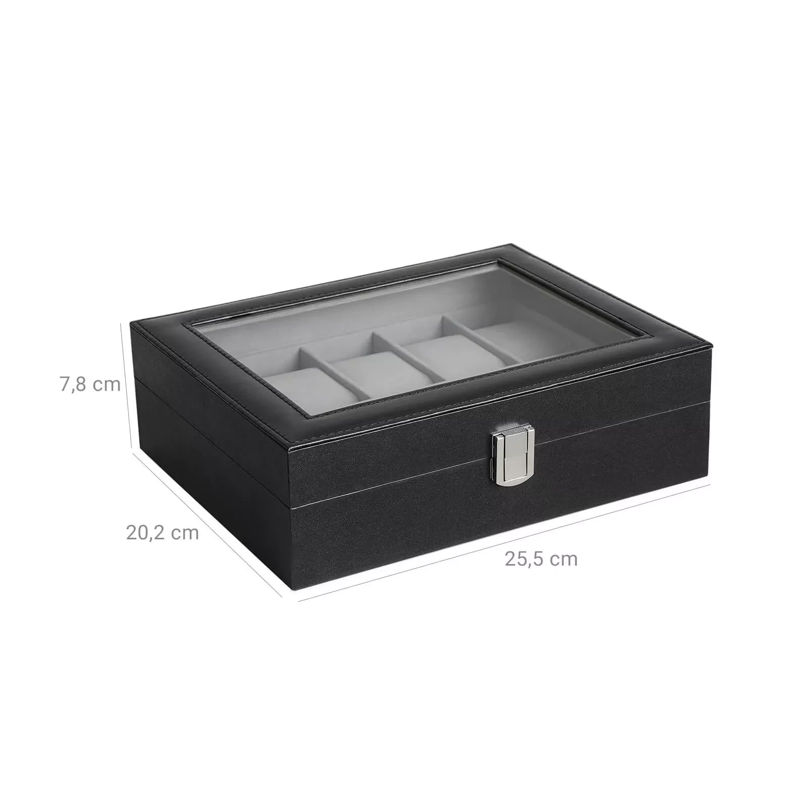 ENOUGH STORAGE: This jewelry box can store up to 10 watches of different sizes. The top is made of glass, so you can still admire your watches. MATERIAL: The jewelry box is made of sturdy MDF wrapped with soft, faux leather and gray gray lining lends great elegance to the box. SAFETY: The jewelry box can be closed tightly with a nice closure that fits perfectly and ensures safe storage. DIMENSIONS: 25.4 x 20.2 x 7.8 cm