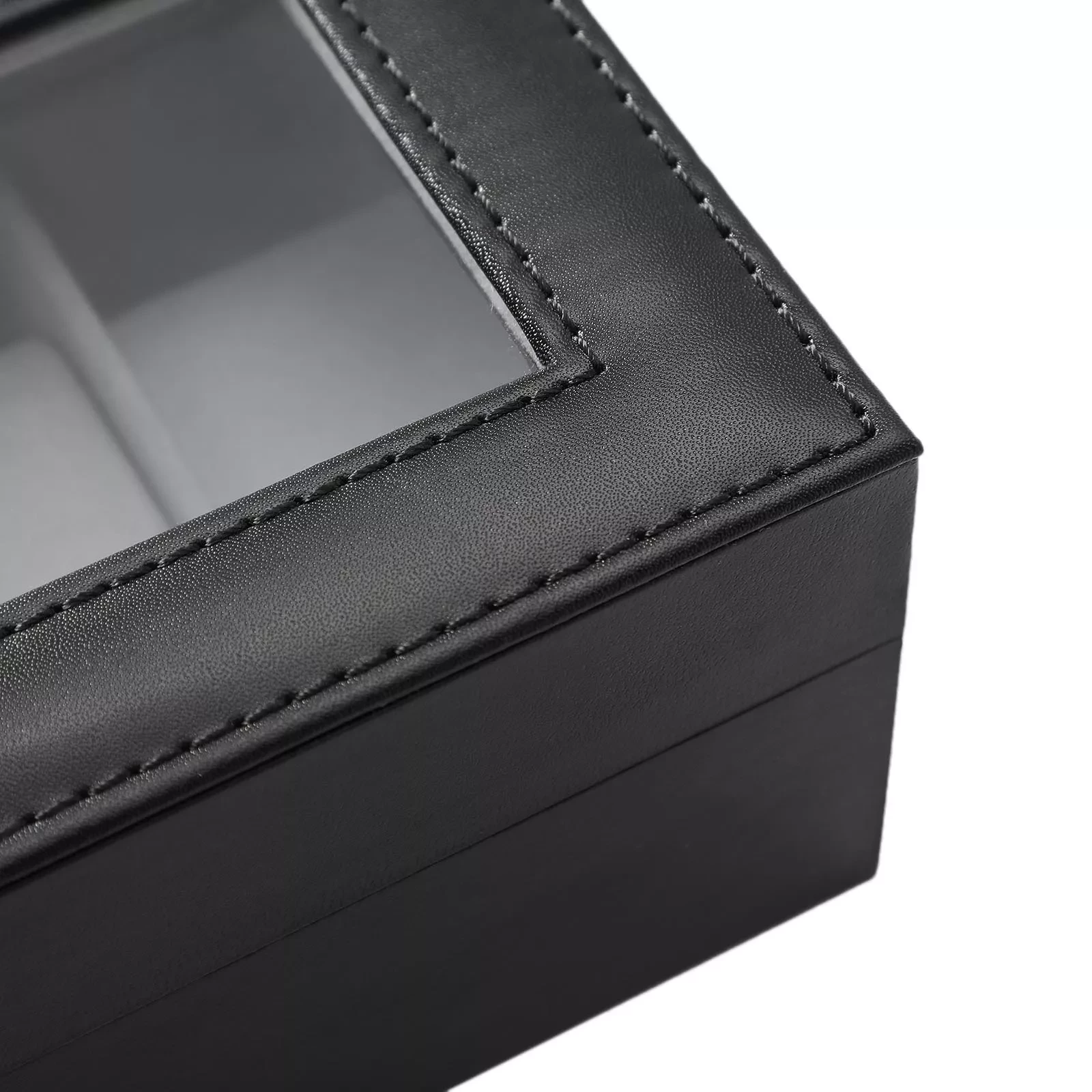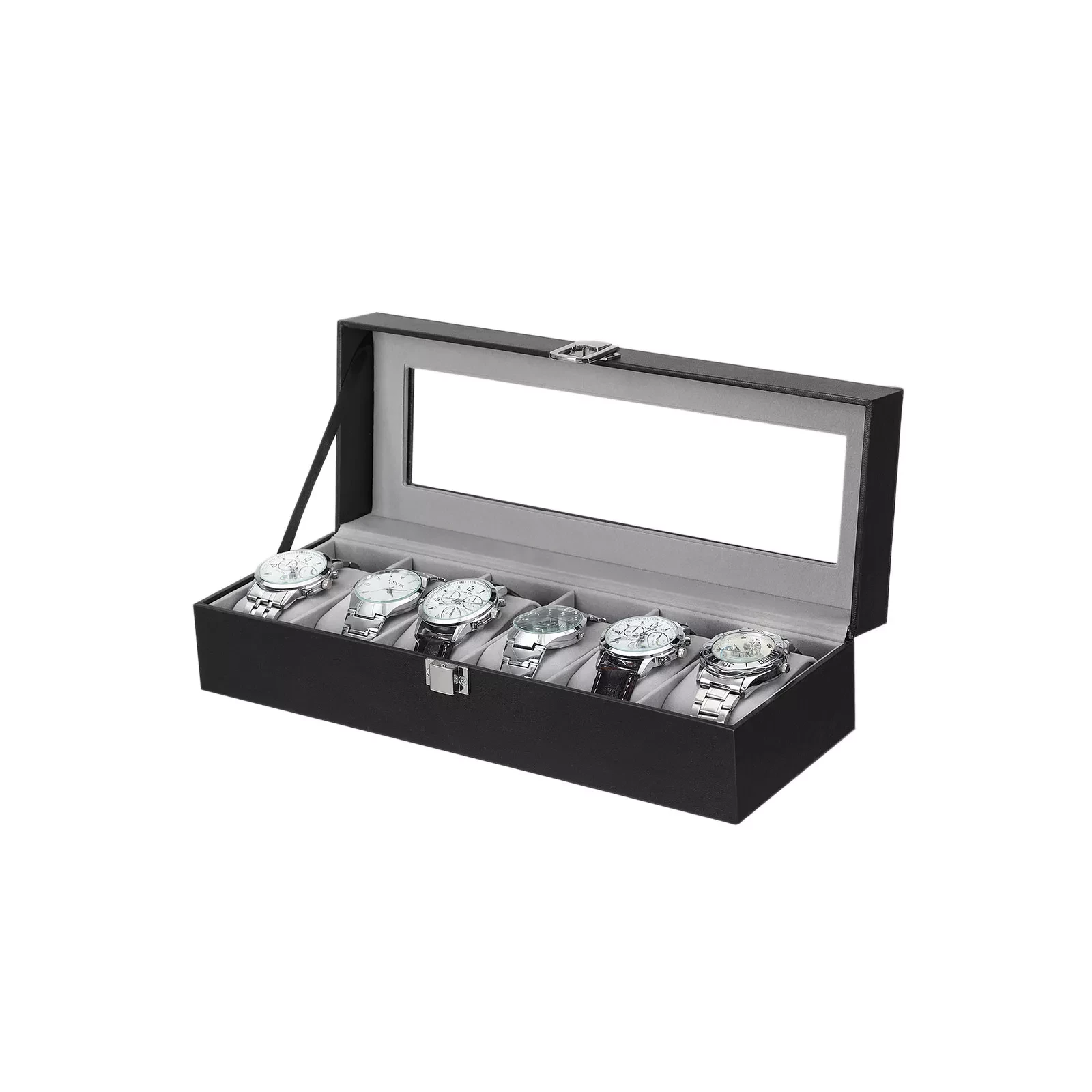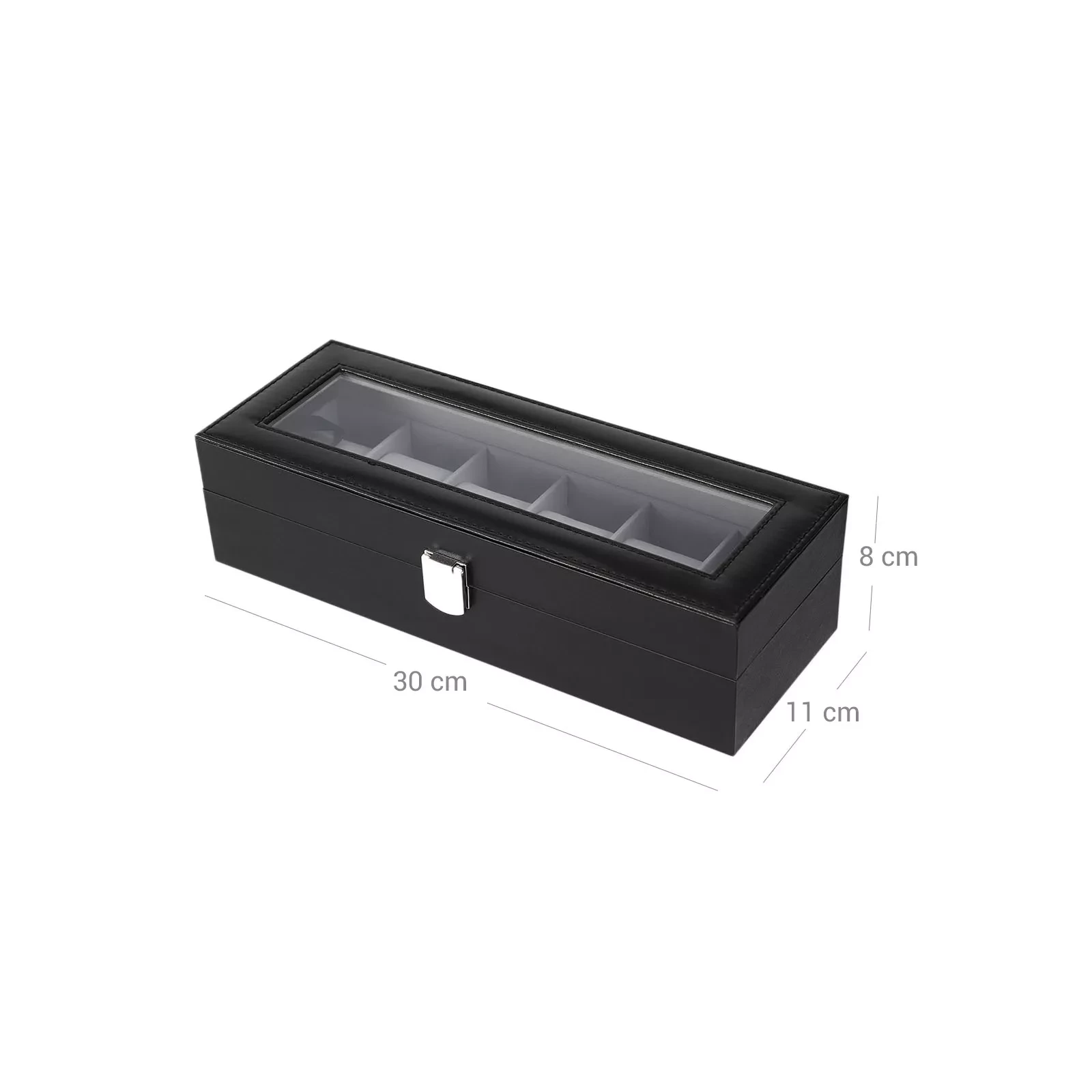 Where's my watch? Do you always forget where you put your watch? Classic and elegant, this glass-topped watch box holds 6 timepieces that were previously gathering dust on your bedside table or sitting in a dresser. Protection is a priority Whether you're an avid watch enthusiast or just starting out collecting, you should protect your jewelry. The high-quality velvet lining, slim shaped cushions and glass lid of this watch case are ideal for protecting your watches from scratches. In addition, the box offers a perfect presentation area for your timepieces, so that you can admire them or show them to your friends at any time.A perfect gift ideaDo you know a watch lover? This watch storage box is a perfect gift for your dad, boyfriend or husband - whether it's for a birthday, Father's Day, Valentine's Day, graduation or Christmas. If you currently keep your personal watch in your girlfriend's jewelry box, you can also treat yourself to this chic accessory.Product details:- Color: Black-Grey- Material: MDF (medium-density fibreboard), velvet, PU synthetic leather, glass- Size : 30 x 11.2 x 8 cm (L x W x H) - Weight: 0.6 kg Package Contents: - 1 x watch box