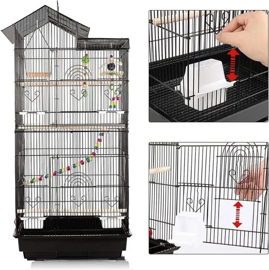 The cage features multiple doors and access points, allowing you to easily access your parrot for feeding, cleaning, and interaction. The top of the cage can be opened and transformed into a play area with a perch, providing additional play space for your bird outside the cage.