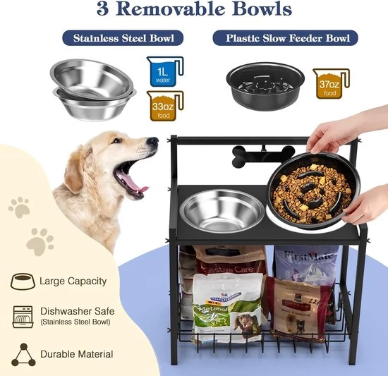 Raised Dog Bowl, Slow Feeding, Dog Bowl, Adjustable Height, with Stainless Steel Bowls and Storage Rack, Raised Dog Feeding Bowl for Medium and Large Dogs
