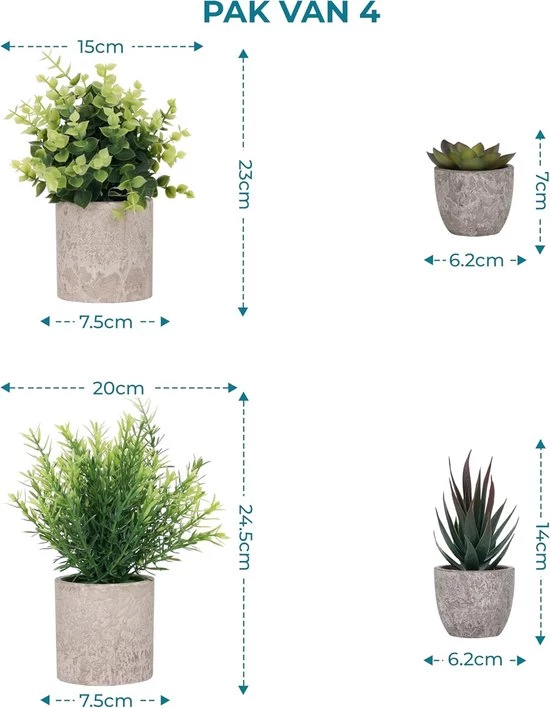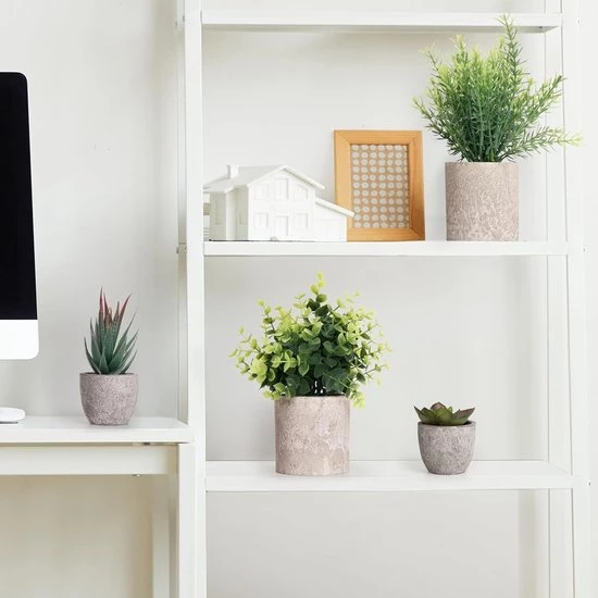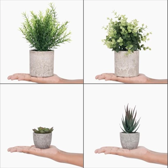 EFFORTLESS ELEGANCE - Transform any space with these small artificial indoor potted plants, which offer the rich beauty of decorative plants without the care. This set of four includes two succulents, a eucalyptus plant, and a snake's tongue grass plant. VERSATILE DECOR - Perfect for office planting, bathroom plant accents, or as a desk plant; the plants measure 6.2 x 7 cm, 6.2 x 14 cm, 15 x 23 cm, and 20 x 24.5 cm. REALISTIC CHARM - Each small artificial plant looks realistic, making them ideal fake plants for the bathroom, bedroom, or any other room that needs a natural touch; the detail in these faux plants mimics the texture and color of real plants. DURABLE STYLE - Made with high-quality materials, these small artificial plants maintain their natural beauty and require no sun or water. Stay tuned, your visitors can think they're real and water them. COMPACT DECOR - Ideal for tight spaces, these mini faux potted plants offer the greenery you want without taking up too much space; their size makes them a great choice for adding a touch of green to your bookshelf or small corner.