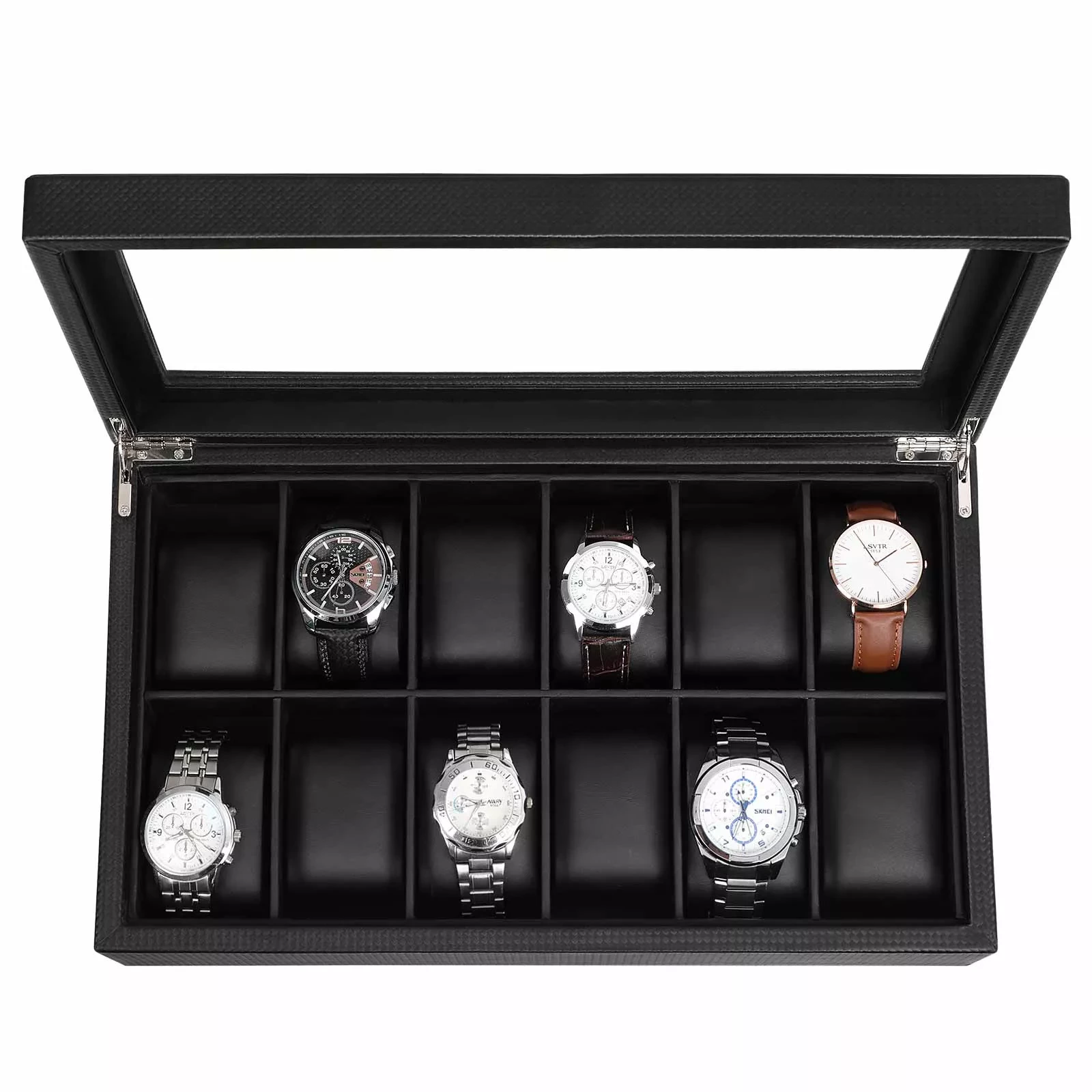 A GREAT BOX FOR WATCH COLLECTORS: Stop looking for the right watch box. You've already found a perfect one! With an elegant look and practical functions, this watch box from InandOutdoormatch keeps your watches neatly and beautifully presented. Less is more: Compared to watch boxes in bright colors, this watch box looks unobtrusive but still elegant, in the classic black and the grained PU cover be optimally combined. If you are a DIY lover, you can also decorate this simple box according to your own creative ideas. Big watches fit in too: With 12 compartments (52 x 52 mm), this watch box meets various needs of watch collectors. Watches of all kinds, whether large sports and military watches, or small ladies' watches, now have their own home. Don't hesitate a minute longer and click "Add to cart" now! Product details: Color: black Material: MDF boards, PU Cover, glass lidDimensions: 36.2 x 9 x 21.3 cm (W x H x D) Weight: 2 kg Scope of delivery: 1 x watch box