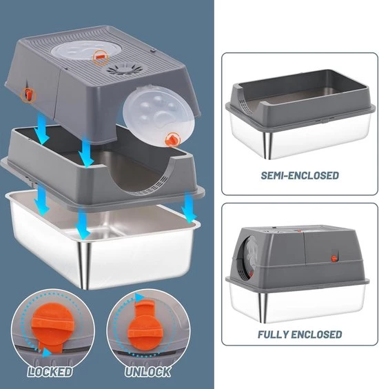 Designed with a modular system, our stainless steel litter box offers both closed and semi-closed configurations to cater to your cat's needs. The closed option provides privacy for your cat while containing litter and odors, while the semi-closed design is ideal for cats who prefer more open spaces.